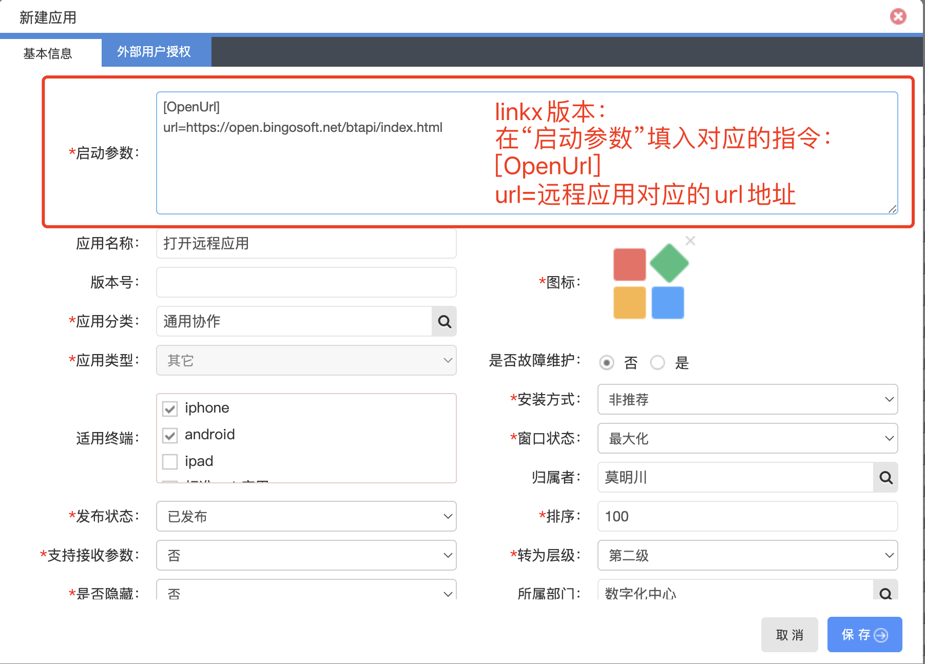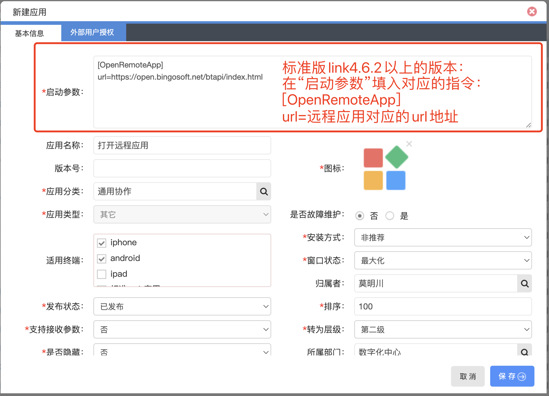 PS:如需在打开远程应用时,将link相关信息例如用户信息、登录信息等传给远程应用,该方式则无法实现,需要通过上架本地应用的方式进行中转来实现,具体可参考“本地应用”的做法