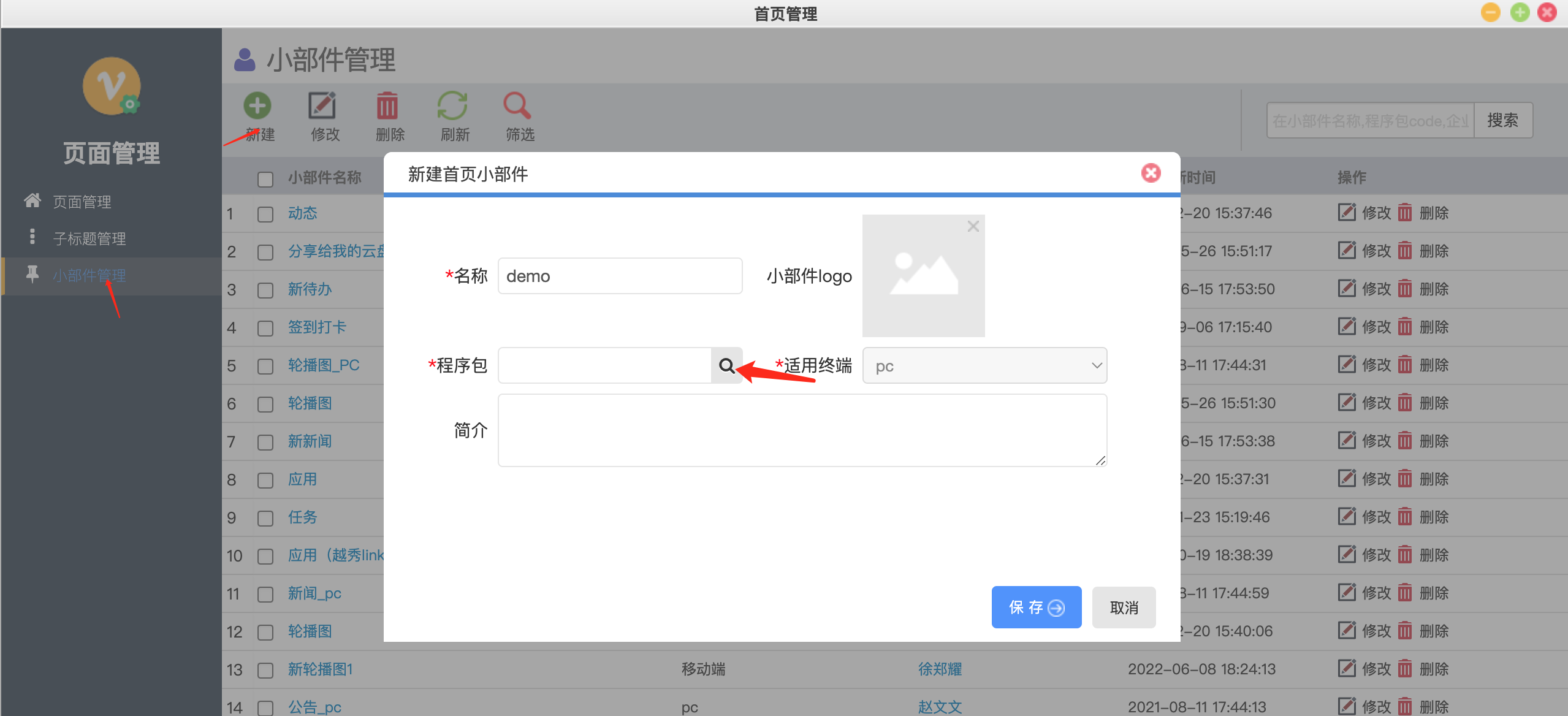 PS: 页面编码可更改,与首页小部件内接口编码保持一致即可