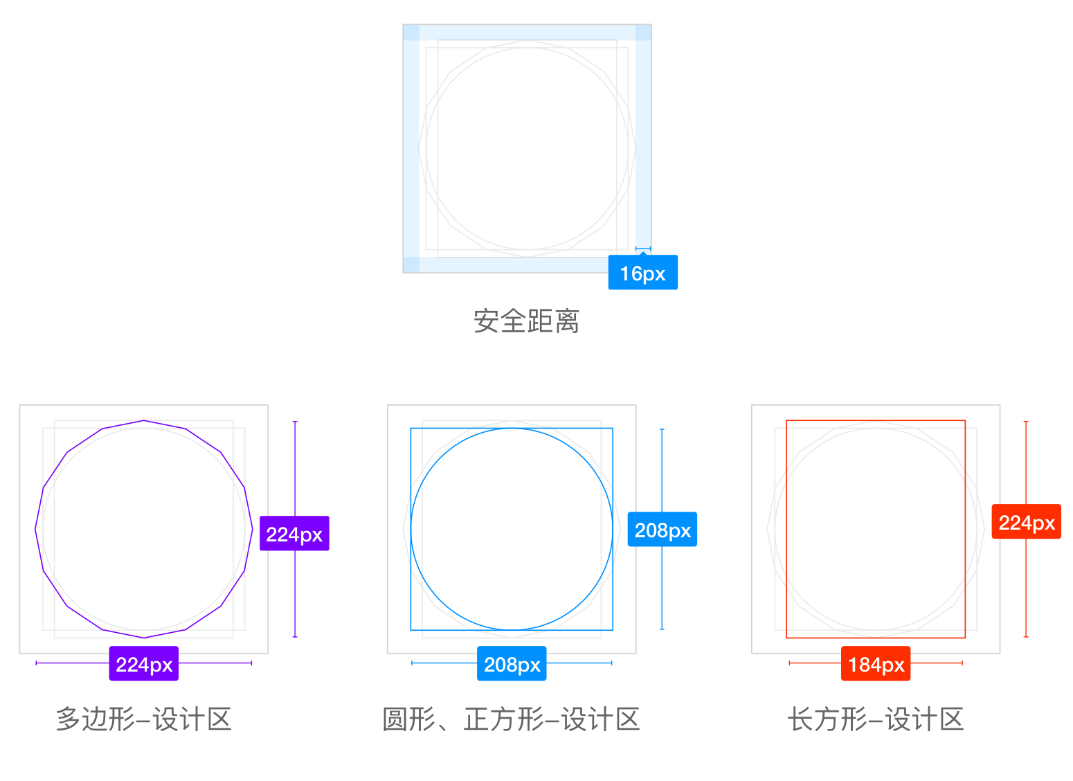 以 256px 的图标为例,⾸先要画⼀个 256px 的正⽅形,确定出⾎线16px,画出内部正⽅形和圆形 (208x208 px),画出多边形(直径224 px),⻓⽅形(184x224 px),具体参数看下图的案例。