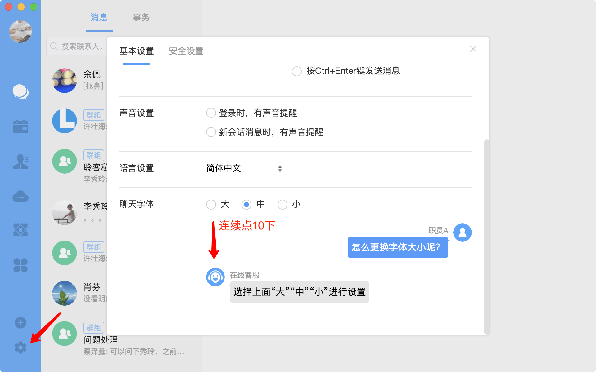 2.滚动基本设置到聊天字体,连续点击在线客服的头像10下。