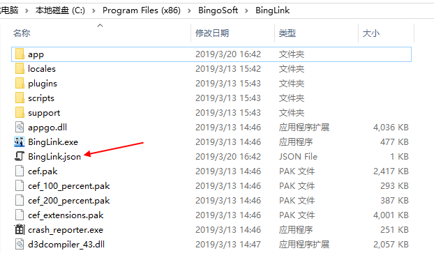 1.去到Link的安装目录,找到BingoLink.json文件(文件名称由打包编译的英文名称决定,例如Glink.json、zhga.json)。