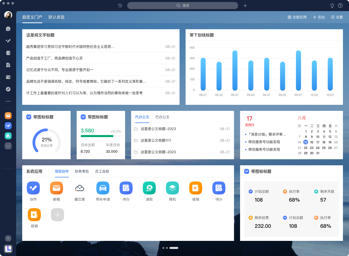 工作台小部件,是工作台页面的重要组成部分,页面不再是一个单一的应用,是由一个个小部件通过页面设计器组合而成。通过产出各式的小部件,构成形式不一的工作台,更可授权给不同的用户展示不同的页面,从而满足中大型企业对页面千人千面的需求,实现个性化客户端的定制。
